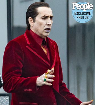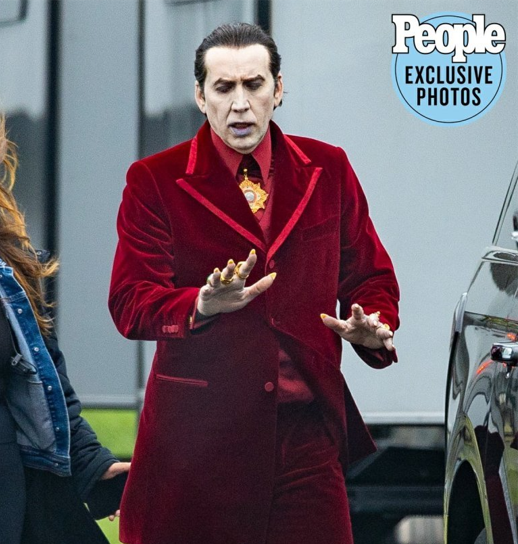 Vestido de traje rojo -como la sangre- con el cabello engominado, cejas delineadas, uñas largas que asoman deslumbrantes anillos entre sus dedos, y la piel bien (por supesto) pálida, podemos ver la estética de Cage (que prepara su inminente estreno "The Unbearable Weight of Massive Talent"), quien permanece oculto para que en él, el público pueda encontrarse con una nueva versión del conde.