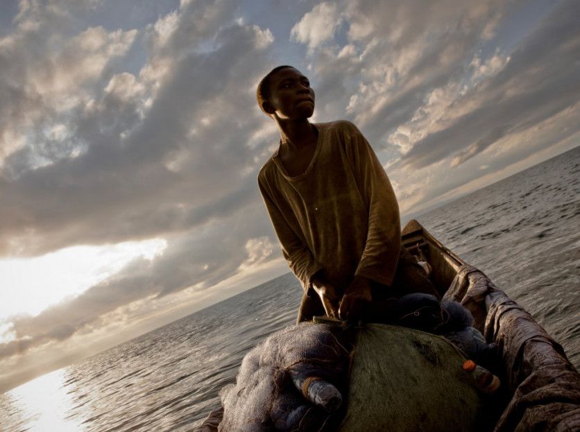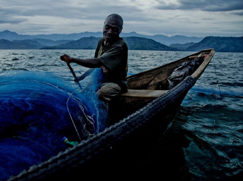 Innocent al amanecer en la canoa en la que trabaja con su hermano Rigobert en el lago Kivu. Han recogido las redes y contado la captura, y se preparan para volver y vender el pescado en el mercado. Innocent dobla las pesadas redes y las envuelve en fundas de plástico para evitar cualquier deterioro, rotura o desgarrón que pudiera permitir escapar a los peces.