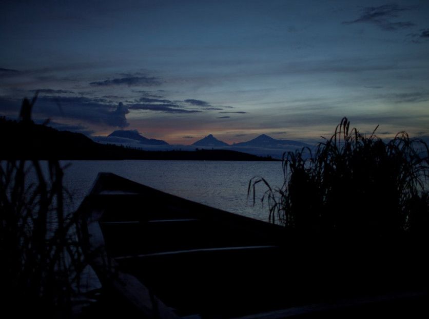 El volcán activo Nyiragongo (izquierda) y los inactivos Mikeno y Karisimbi en los montes Virunga, vistos al amanecer desde el pueblo pescador de Kasunyu, en la provincia de Kivu del Sur. Las comunidades pescadoras del este de la República Democrática del Congo sufren las consecuencias de los efectos acumulados de la actividad volcánica, los conflictos y el cambio climático. En las tierras altas volcánicas del país centroafricano, la vida se desarrolla en torno al lago Kivu. En sus orillas, los pobladores han encontrado un lugar donde refugiarse de las numerosas guerras y situaciones de emergencia, pero el salvavidas es frágil. HUGH KINSELLA CUNNINGHAM