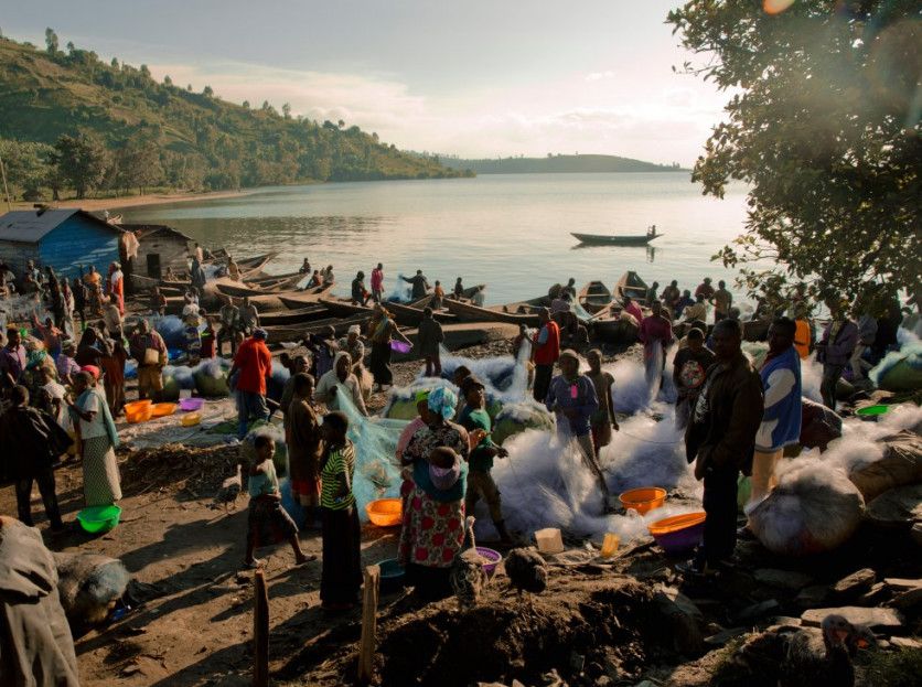 Playa del pueblo de Kasunyu, a orillas del lago Kivu. Cada día, después del amanecer, los pescadores vuelven al pueblo con sus capturas y este lugar se convierte en un mercado frenético cuando las comerciantes se reúnen alrededor de los barcos recién llegados para comprar pescado fresco que venderán en los mercados de todo el territorio. En la República Democrática del Congo y en Ruanda, centenares de miles de personas dependen del pescado del lago como fuente de proteínas cuando apenas hay otra disponible. Los pescadores, agotados tras horas de duro trabajo en el lago, aceptan el mejor precio que encuentran y preparan sus barcas y sus redes, listos para el siguiente viaje. HUGH KINSELLA CUNNINGHAM