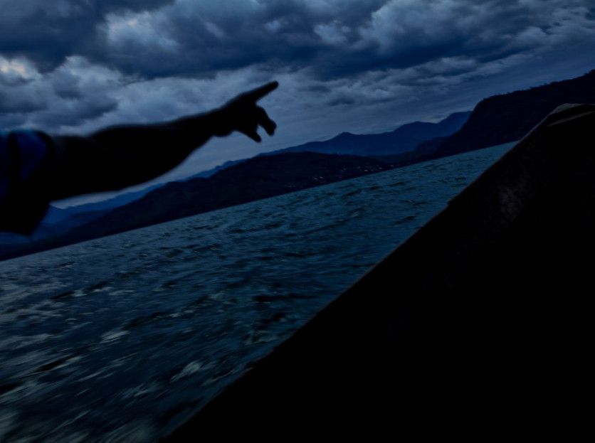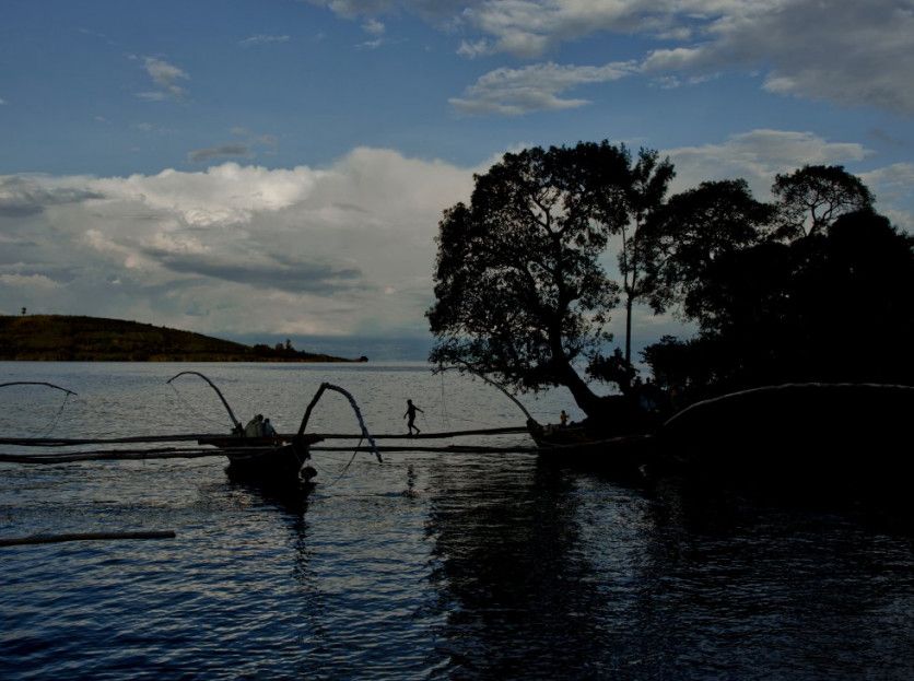 Pescadores del lago Kivu al atardecer mientras empieza a soplar un fuerte viento. En la estación de lluvias, las tormentas y los fuertes vientos llamados 'eshora' forman mortíferos tornados, considerados por las comunidades fuerzas maléficas. HUGH KINSELLA CUNNINGHAM