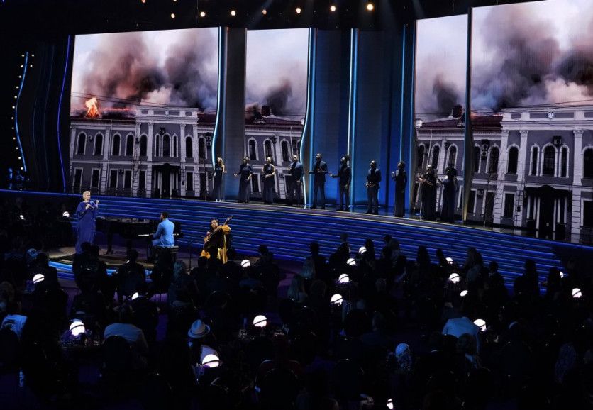 Uno de los momentos más emotivos de la noche tuvo lugar durante la actuación de la cantante ucraniana Mika Newton, que interpretó 'Free' junto a John Legend mientras se mostraban imágenes de la devastación en su país por la invasión rusa. CHRIS PIZZELLO AP