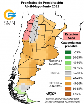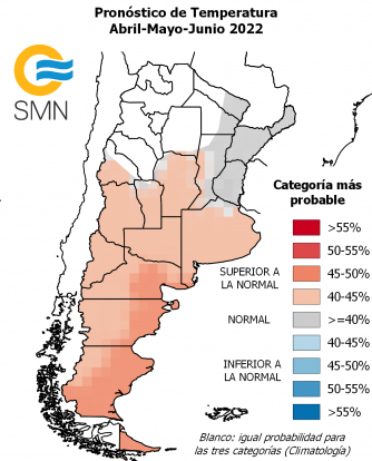 Para el periodo comprendido entre abril y junio de 2022 se observa una mayor probabilidad de que la temperatura sea superior a lo normal en el este y sur de la Patagonia. Además, sobre gran parte del centro del país y el oeste patagónico, en promedio, las temperaturas pueden ser normales o superiores a lo normal.