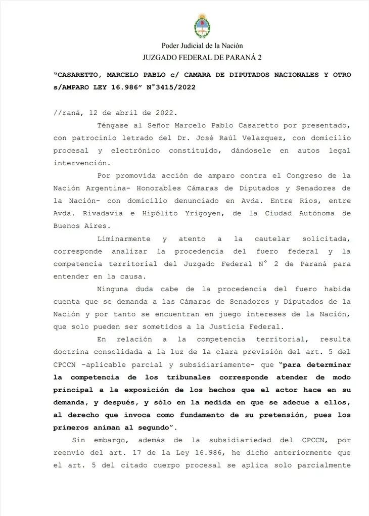 "Hoy el Juzgado Federal N° 2 de Paraná hizo lugar a mi presentación ordenando a los Presidentes del Senado y de Diputados @CFKArgentina y @SergioMassa se abstengan de designar nuevos miembros del Consejo de la Magistratura, y les otorga 5 días hábiles para efectuar los descargos", anunció Casaretto en su cuenta de Twitter.