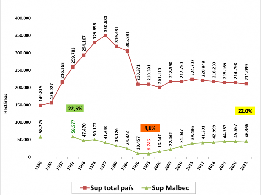 Pero antes de este milenio, atravesó algunos altibajos. Cuando aún estaba lejos de ser un boom, ya había alcanzado su pico de implantación en 1962 con casi 58.700 hectáreas para caer en el tiempo hasta cerca de 9.000 en la década del '80. Luego vendría el "descubrimiento" del Malbec de la mano de los varietales de alta gama y la ola de capitales foráneos que empezaron a invertir en la aún desconocida vitivinicultura argentina desde mediados de los '90.
