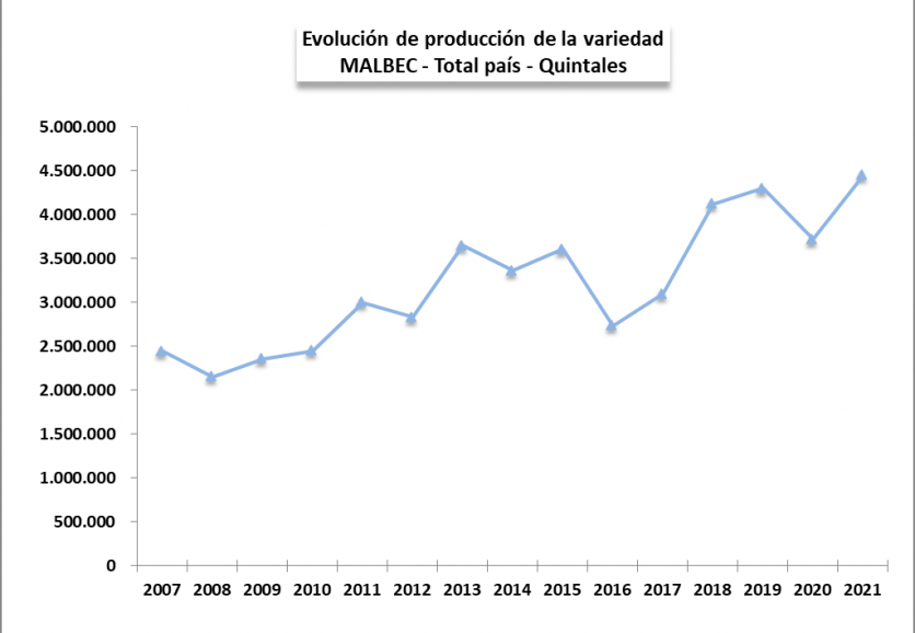 Lo cierto es que hoy la uva Malbec continúa al frente como la de mayor producción: el ùltimo año se cosecharon 4,4 millones de quintales, esto es, 20.4% del total de materia prima ingresada a establecimientos para elaboración, y 4 de cada 10 kilos de toda la uva tinta vinificable.
