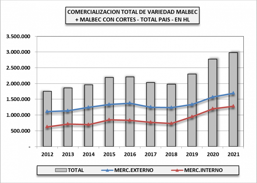 Con una participación de 51,6% entre los varietales comercializados en el mercado interno, sostiene el ritmo de crecimiento. Un ritmo que, sin embargo, venía de un bajón que había dejado la comercialización total (ME y MI) por debajo de los 2 millones de hectólitros entre 2017 y 2018.
