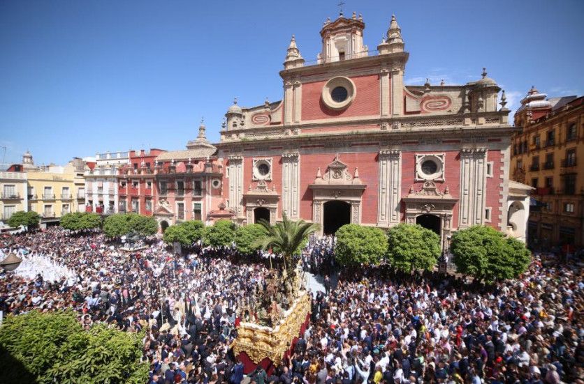 Multitud de fieles se congregaron ante la iglesia Colegial del Divino Salvador, en Sevilla, para presenciar la salida de La Borriquita, la hermandad que abrió la carrera oficial del Domingo de Ramos.