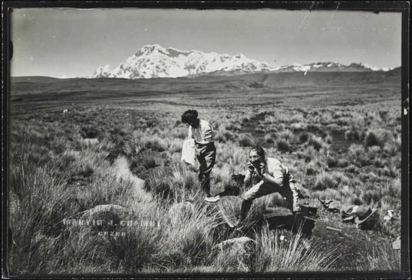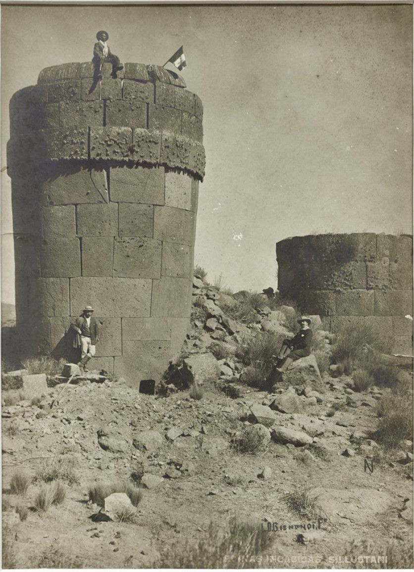 Autorretrato en la Chulpa Real, ruinas incaicas de Sillustani, Puno. Ca. 1910.