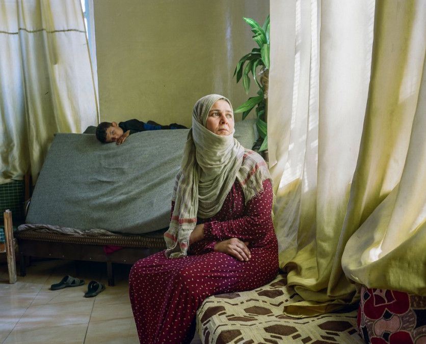 Manal, líder de la comunidad, y su hijo, en una antigua escuela para desplazados donde vive con su familia, en un pueblo de la gobernación de Hasake. La familia abandonó su ciudad de origen tras los intensos bombardeos de Turquía en el ataque de octubre de 2019. ALESSIO MAMO
