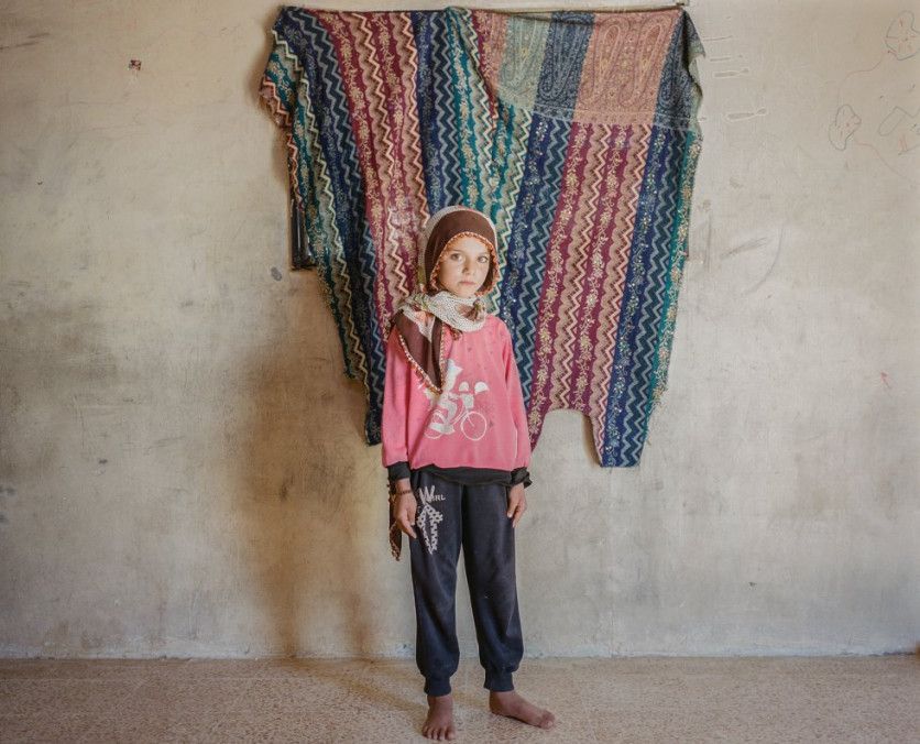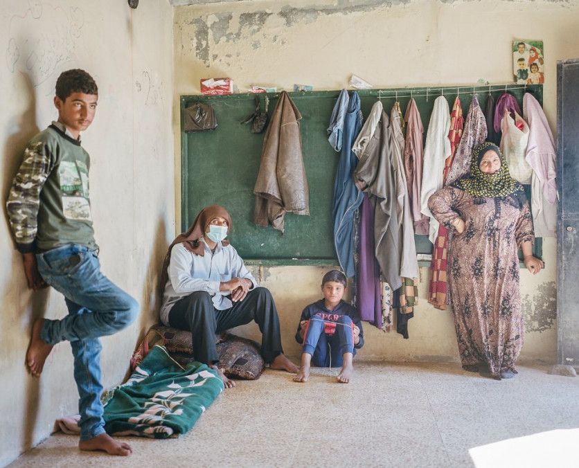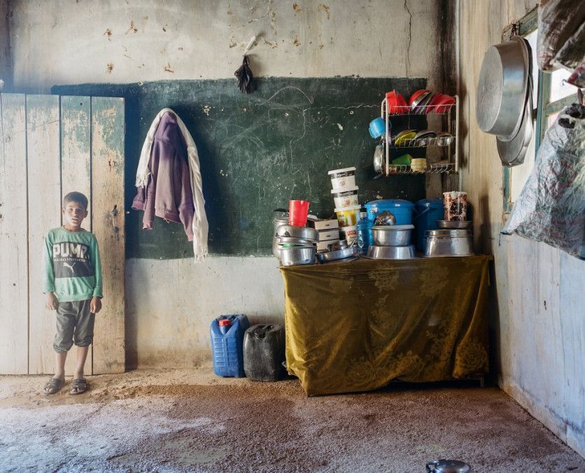 Moyad, dentro de un aula en una antigua escuela convertida en centro colectivo de acogida, donde vive con su familia en un pequeño pueblo de la gobernación de Hasake. Los niños desplazados, a pesar de vivir en un colegio, no pueden asistir a ninguno de ellos en el pueblo o fuera de él debido a los costes de transporte. La familia de Moyad, como tantas otras, tiene dificultades para llevar comida y no puede cubrir ningún otro gasto. ALESSIO MAMO
