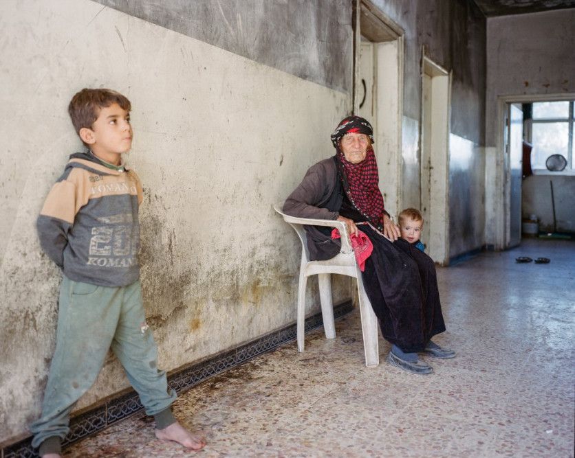 Una abuela con sus nietos en el pasillo de una antigua escuela donde viven los desplazados en un pueblo de la gobernación de Hasake. Los niños sufren las peores consecuencias de los 10 años de conflicto en Siria. De los siete millones de desplazados internos del país, 3,1 millones son menores de edad. ALESSIO MAMO
