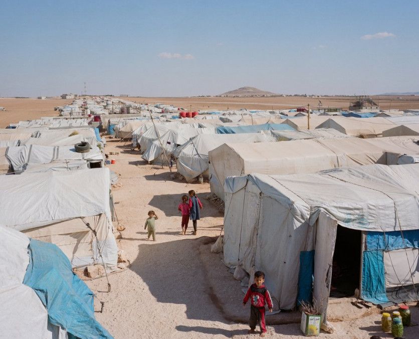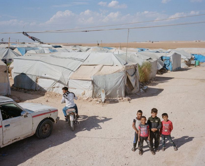 Una familia de Homs desplazada en un campo cerca de la ciudad de Raqqa. Algunos de ellos consiguen trabajar en los campos cercanos, mientras que los niños permanecen en el campamento y no tienen posibilidades de ir a la escuela. Las familias que viven en la pobreza temen que sus hijos sean discriminados en los colegios del pueblo cercano y por eso prefieren no invertir en su educación. ALESSIO MAMO