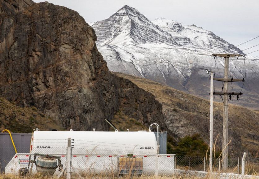 Tanque de Gasoil en la Unidad y Planta Cloacal El Chaltén, al lado de Confluencia, en donde se unen el Río Fitz Roy y el Río de Las Vueltas. Durante 20 años, todas las mañanas, tardes y noches,los habitantes vivieron con un ruido rugiente frente a sus casas y una amenaza a la reserva natural: una usina generadora de electricidad para todo el pueblo mediante la quema de combustible fósil. NATALÍ ORMAZÁBAL