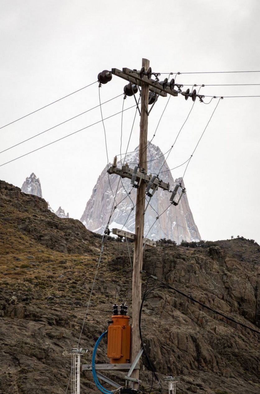 Transformador de electricidad al lado del Río Fitz Roy en marzo de 2022. En 2021, la municipalidad de El Chaltén adhirió a los Objetivos de Desarrollo Sustentable de la Agenda 2030. Uno de esos objetivos se refiere a la disponibilidad de agua y su gestión sostenible. NATALÍ ORMAZÁBAL