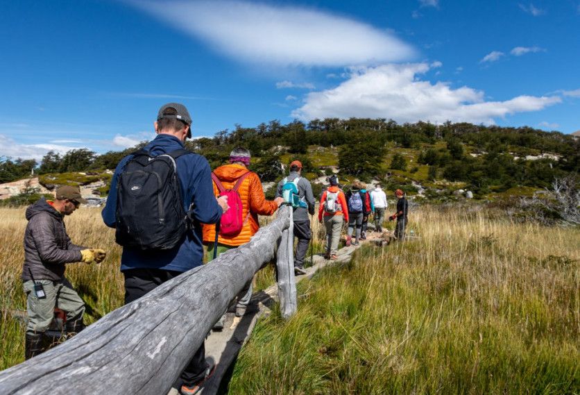 Paso de turistas durante los trabajos de mantenimiento de sendas en el sendero Fitz Roy, kilómetro 7, por parte de la Brigada de Sendas (PNLG). La Administración de Parques Nacionales tiene un presupuesto limitante para la conservación de los senderos naturales. Muchos tramos presentan señales de erosión no solo por la cantidad de turistas; hasta 2009 se autorizaba la circulación a caballo. NATALÍ ORMAZÁBAL