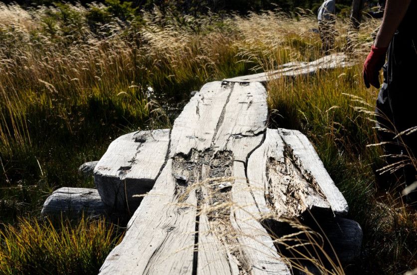 Ejemplo de un tramo dañado del sendero Fitz Roy, kilómetro 7, en febrero de 2022. El desarrollo del turismo, aunque llamado "sustentable" choca con los efectos de obras de infraestructura en este lugar. NATALÍ ORMAZÁBAL