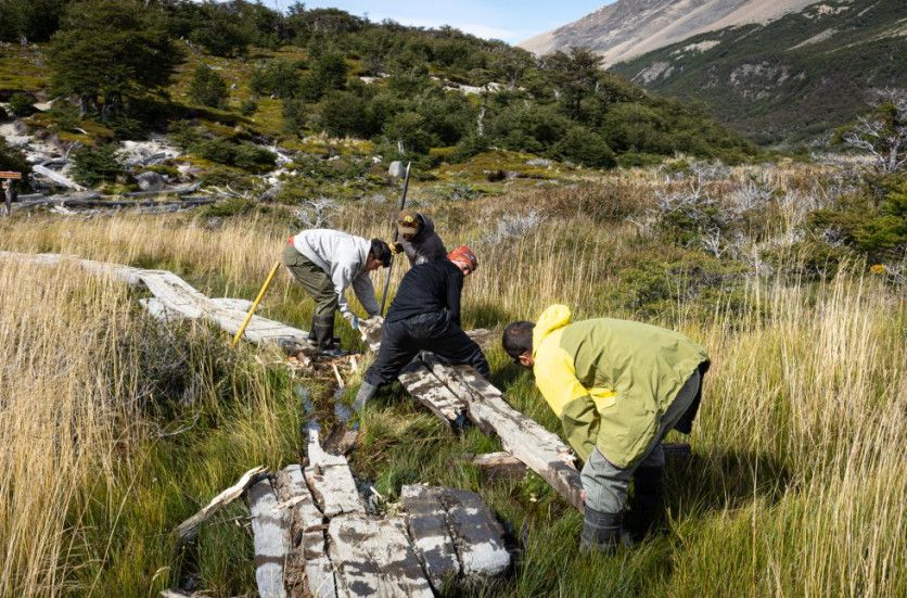 Trabajos de mantenimiento de sendas en el sendero Fitz Roy, kilómetro 7, por parte de la Brigada de Sendas (PNLG), en febrero de 2022. NATALÍ ORMAZÁBAL