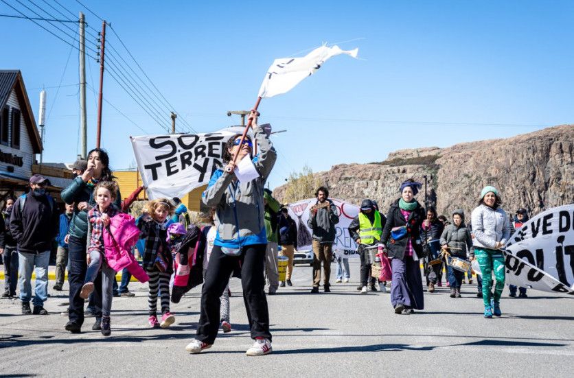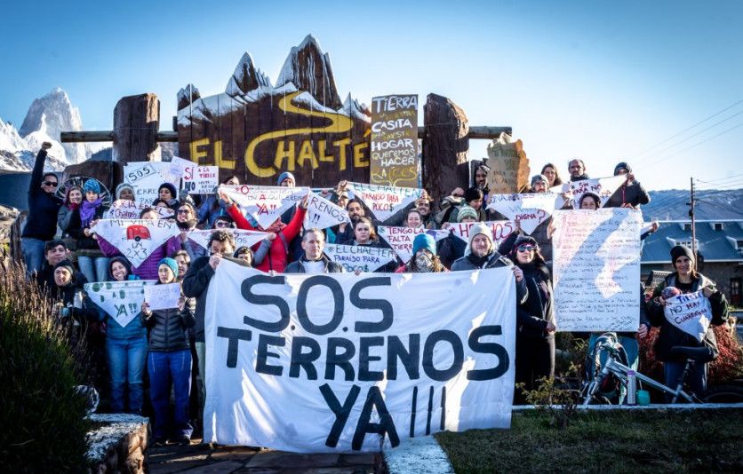 Varios integrantes de la Asamblea de Vecinos Unidos se manifiestan en la entrada del pueblo para pedir a la Municipalidad de El Chaltén y al Concejo Agrario Provincial que declaren la emergencia habitacional de la comunidad. NATALÍ ORMAZÁBAL