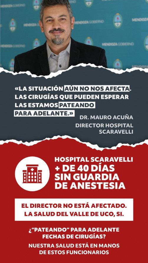 En el caso del Scaravelli, en Tunuyán, a hoy se contabilizan entre 250 y 300 cirugías en espera, a las que se acumulan 80 por mes. Un dato por demás preocupante es que este efector no tiene anestesiólogo de guardia los fines de semana.
