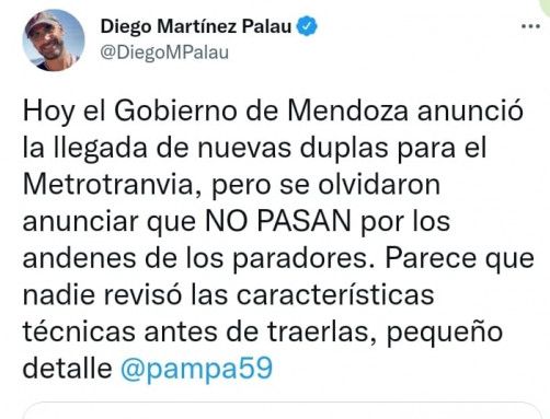 Es que el ex ministro de Transporte de Mendoza, Diego Martínez Palau, quien fue el que puso la piedra fundacional de este sistema de transporte, salió a advertir vía Twitter, que las duplas en cuestión "no pasan por los andenes de los paradores". "Parece que nadie revisó las características", advirtió el funcionario de Celso Jaque y Francisco Pérez.