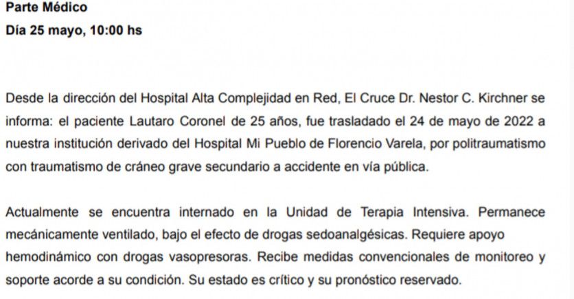 "Lautaro Coronel fue derivado a nuestra institución desde el Hospital Mi Pueblo de Florencio Varela por politraumatismos con traumatismo de cráneo grave por un accidente en la vía pública", detallaron en el comunicado.