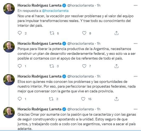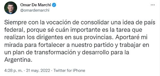 Por su parte el diputado, Omar De Marchi, le agradeció el gesto al Jefe de Gobierno. "Me enorgullece asumir la responsabilidad de trabajar a la par de @horaciorlarreta en la construcción de una propuesta a lo largo y ancho del país, como lo hizo @diegosantilli".