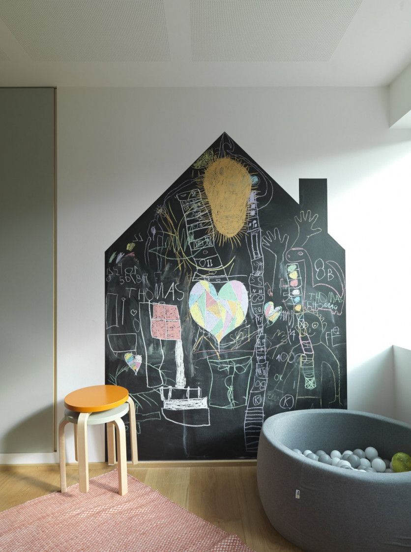 En el sótano está el cuarto de juegos. La pizarra con forma de casa fue una petición de la madre, que es enfermera, y está convencida de que los niños dibujan y escriben lo que anhelan, disfrutan o temen.