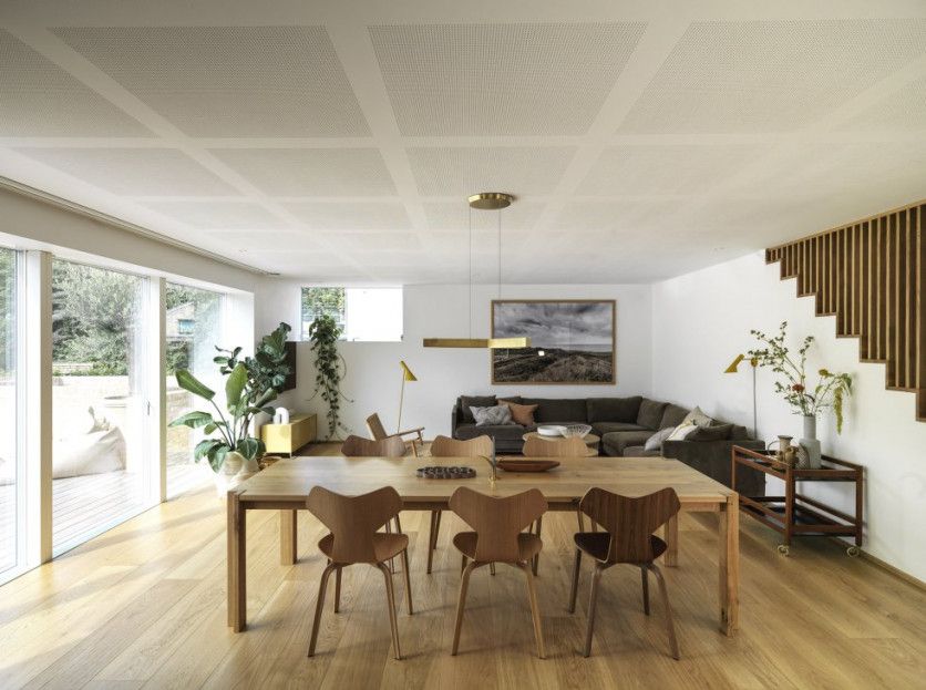 Salvo algunas paredes oscuras que contrastan, la casa está amueblada con tonos naturales y madera de roble. El comedor, el salón y la cocina comparten la planta baja. La mesa es un diseño del arquitecto Jeppe Utzon. Las sillas, de Arne Jacobsen, las produce la empresa Fritz Hansen. La lámpara de techo es de la marca danesa Amour. El carrito-camarera lo diseñó Børge Mogensen. Y el sofá lo produce la empresa Eilersen. Mads Mogensen