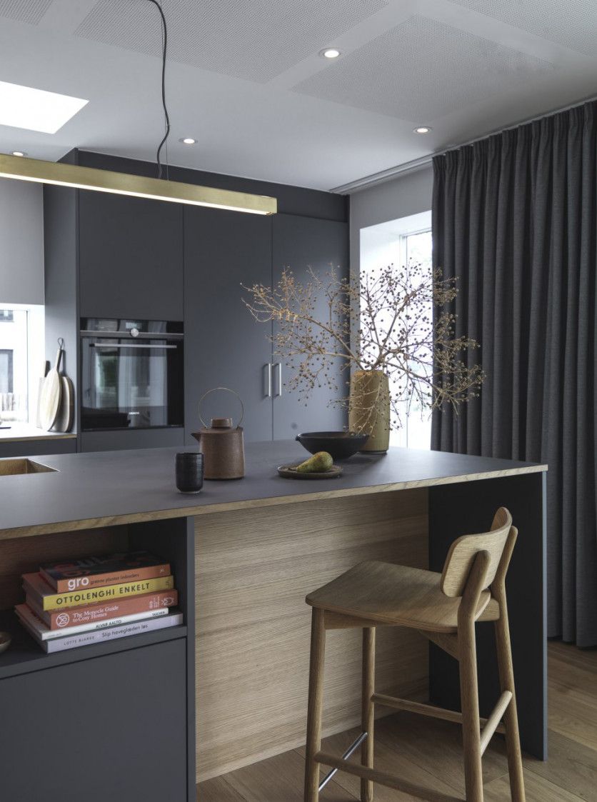 Madera de roble, paredes pintadas de gris y acabados de cobre: la cocina fue diseñada por Jeppe Utzon y los arquitectos de su estudio. Las cerámicas son de la danesa Tina Marie. La lámpara de techo es de Amour, y los taburetes son el modelo Hven de la danesa Skagerak.