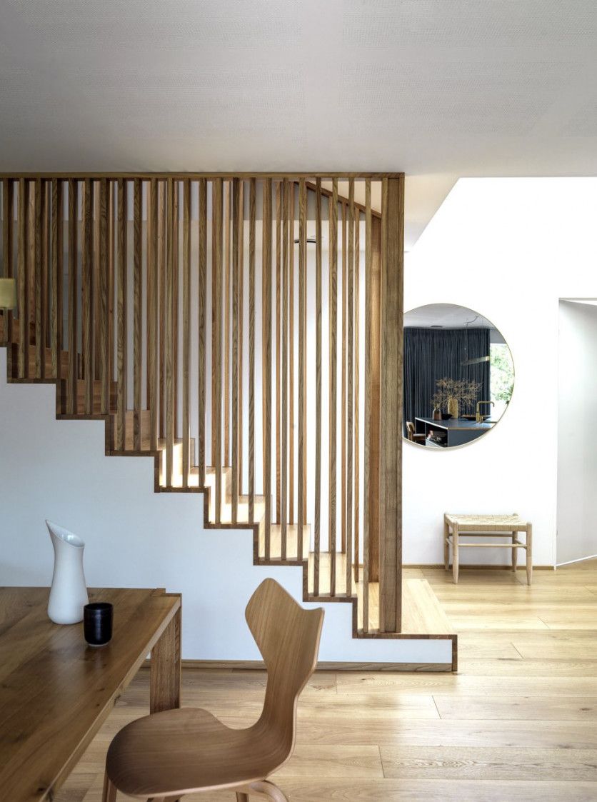 La escalera de roble que conecta ambos pisos actúa de lucernario y oculta una serie de armariosalmacenes blancos. Mads Mogensen