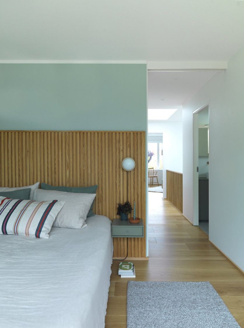 El dormitorio principal mezcla el roble -del suelo y el cabezal, afín a la barandilla de la escalera y al zócalo de los dormitorios- con el color verde claro de las mesillas y las paredes. Los cojines son de Society y Arket. Y la alfombra, de H&M Home. Mads Mogensen