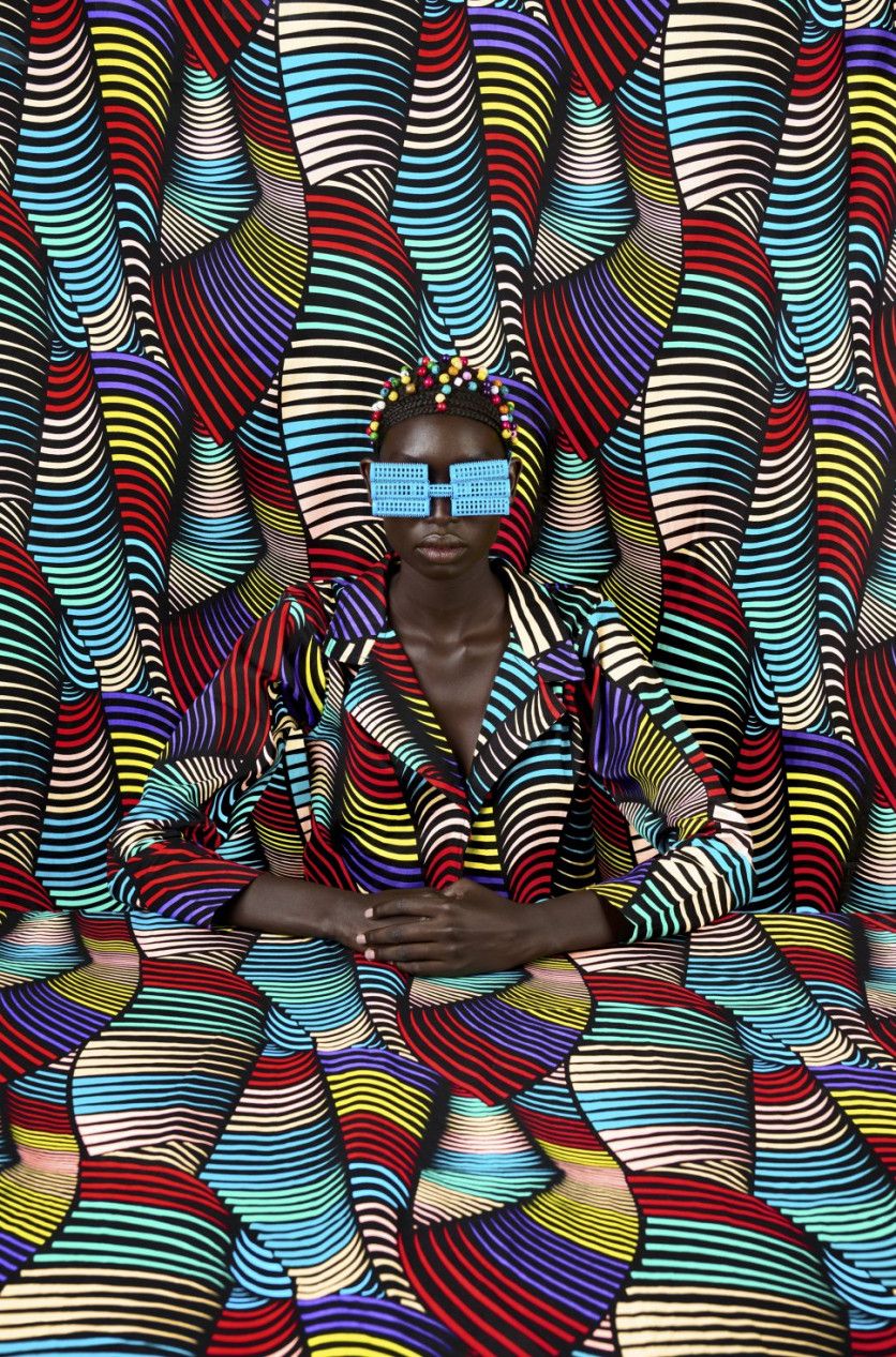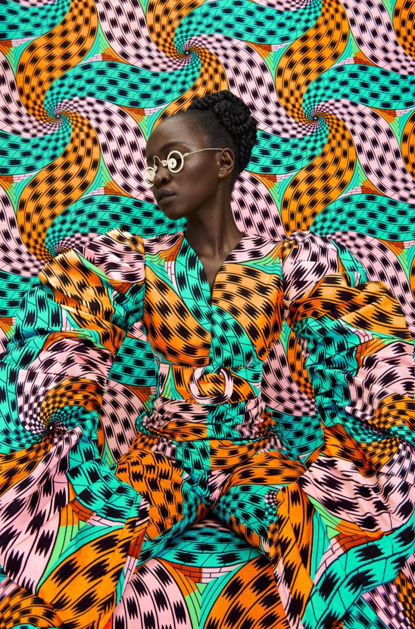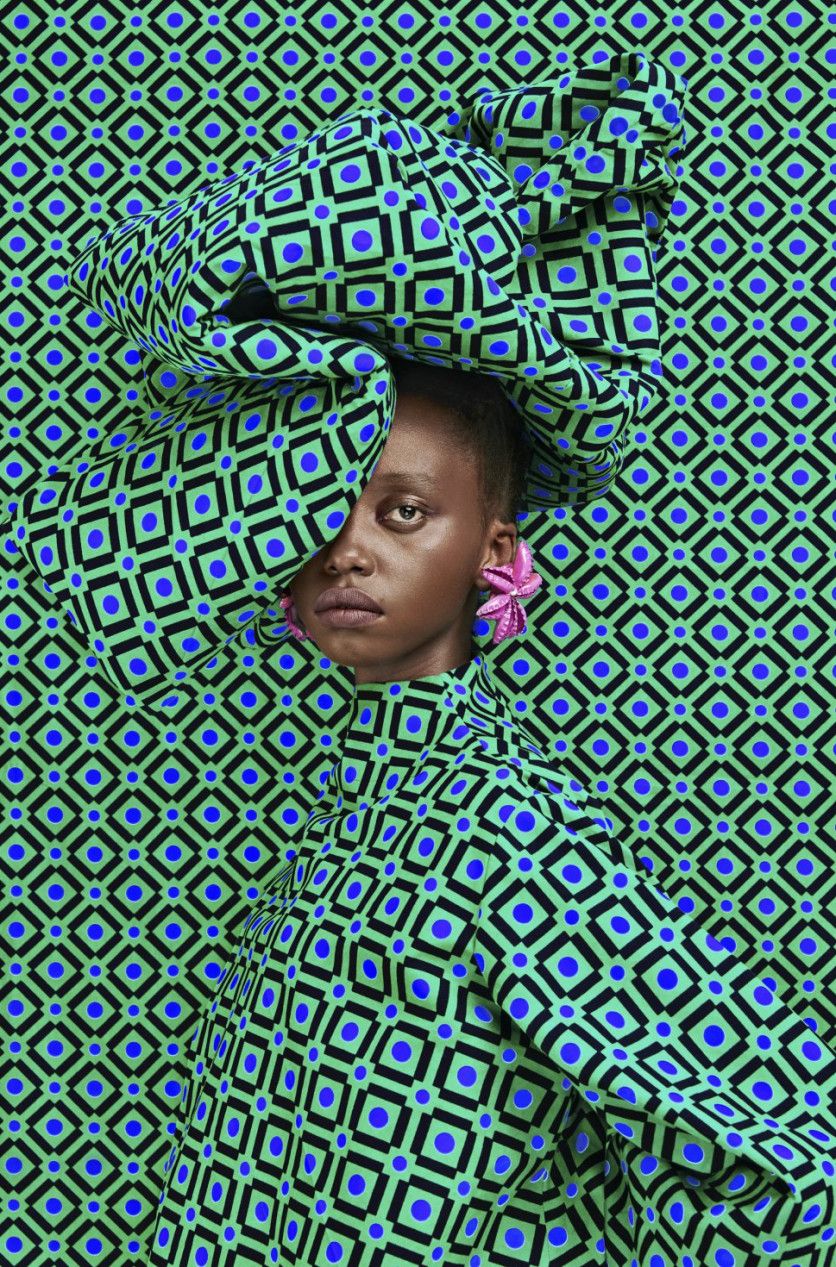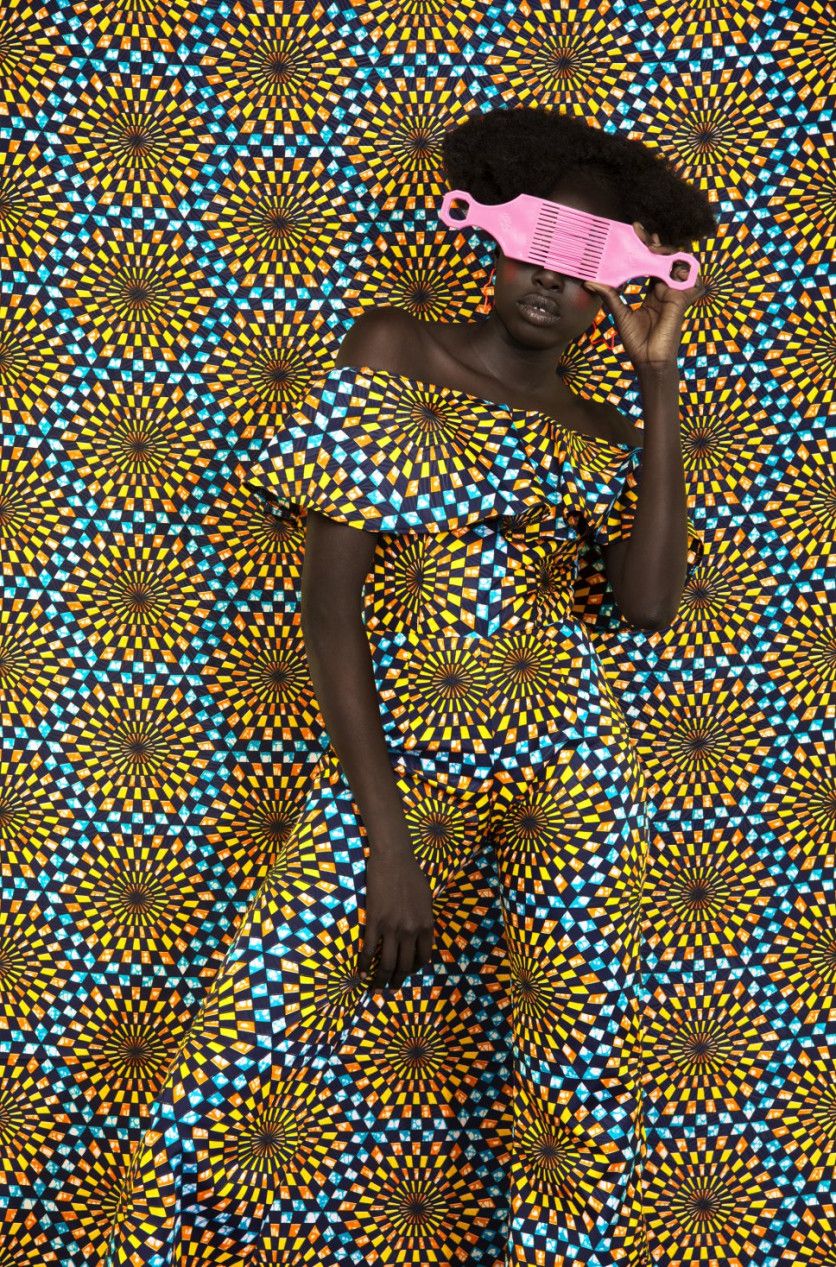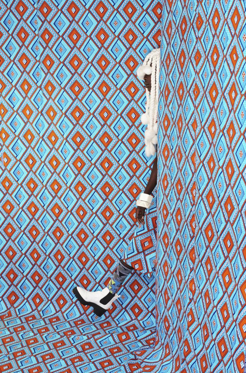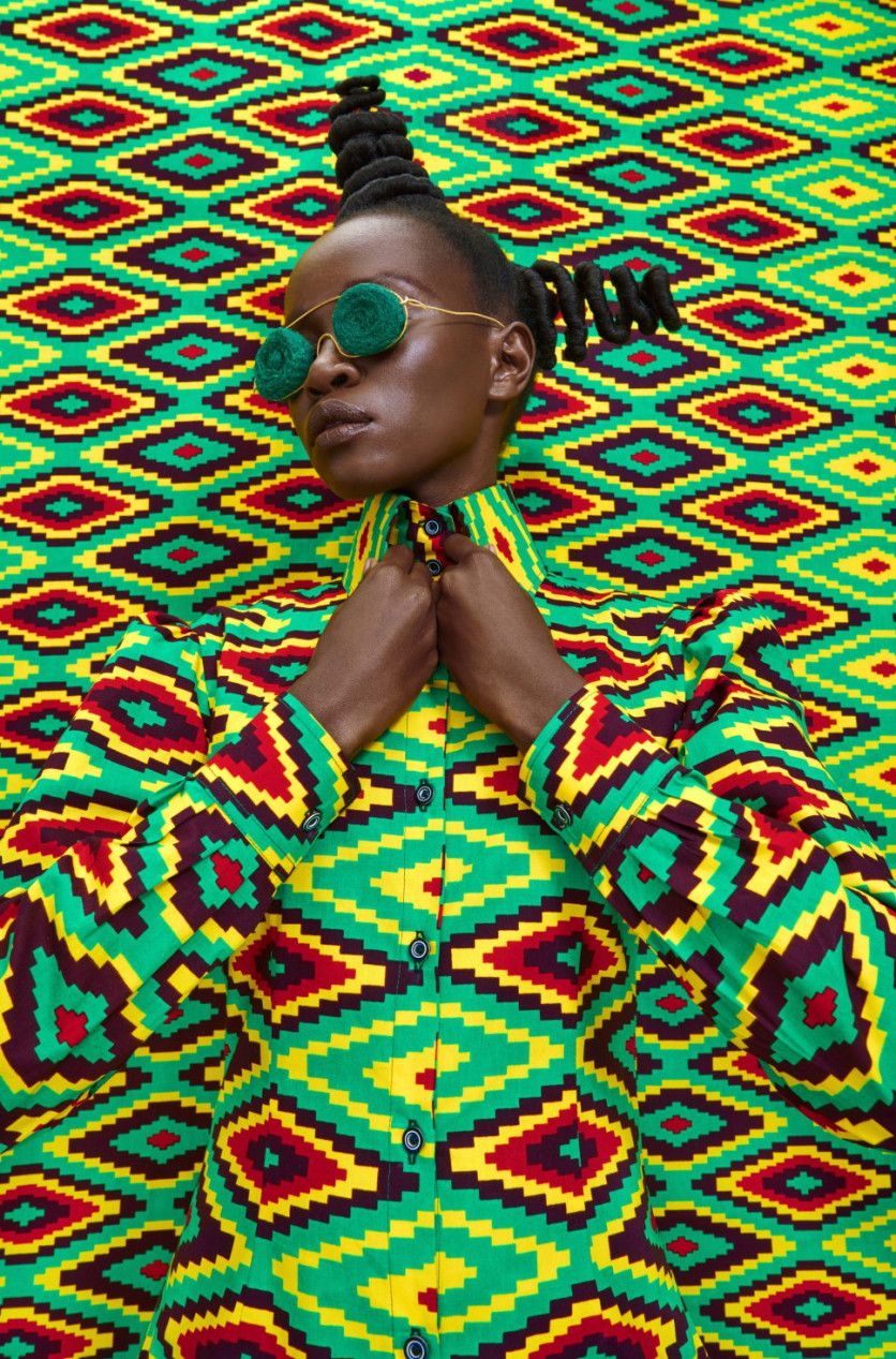 La fotógrafa keniana Thandiwe Muriu usa un proceso meticuloso para construir sus imágenes. Todo comienza con la elección de la tela africana adecuada. Después, crea los peinados y los accesorios. La intención de su serie Camo, de camuflaje, es crear un juego óptico en el que las modelos casi desaparecen.