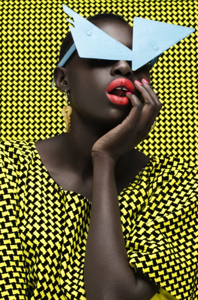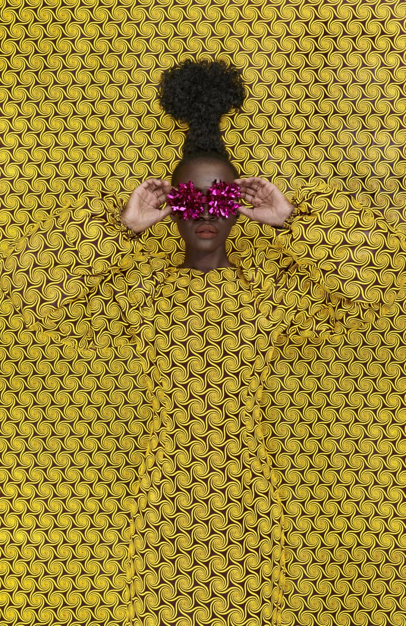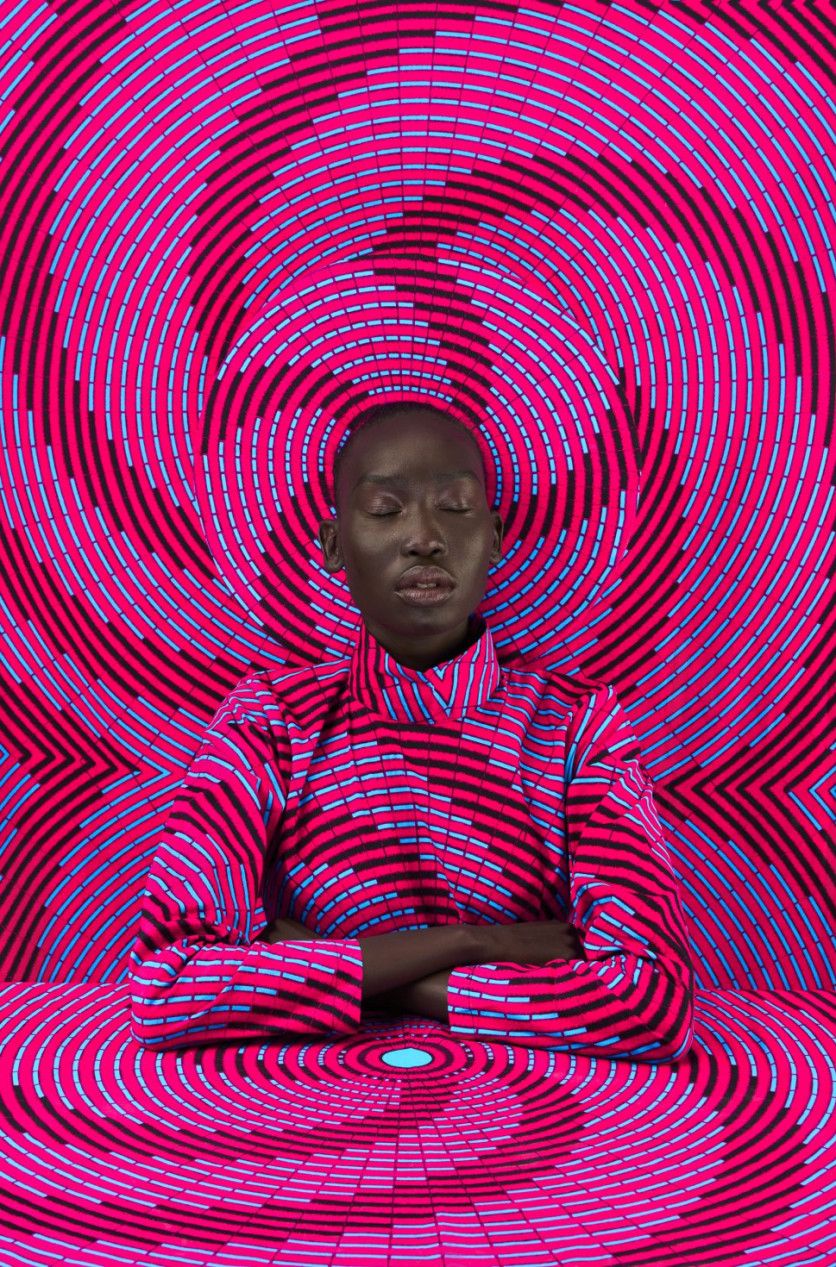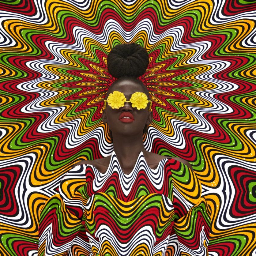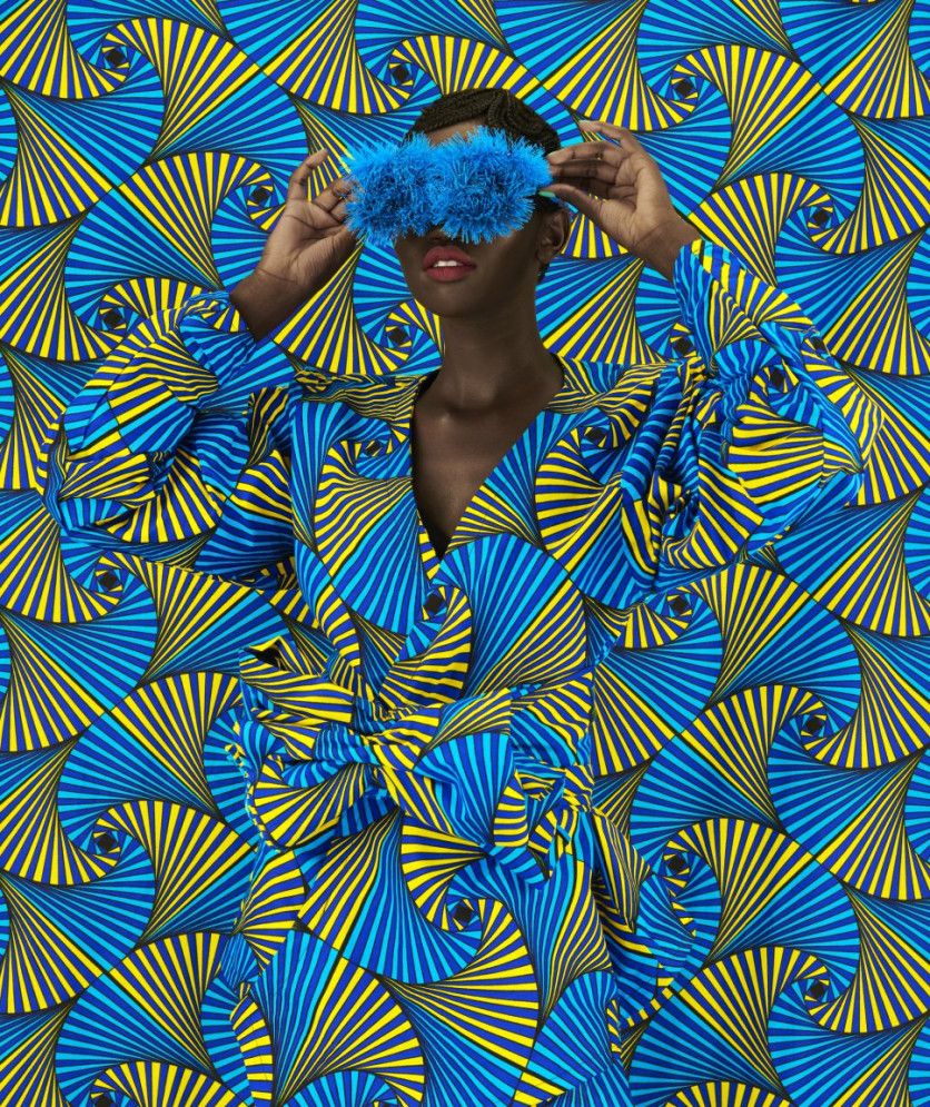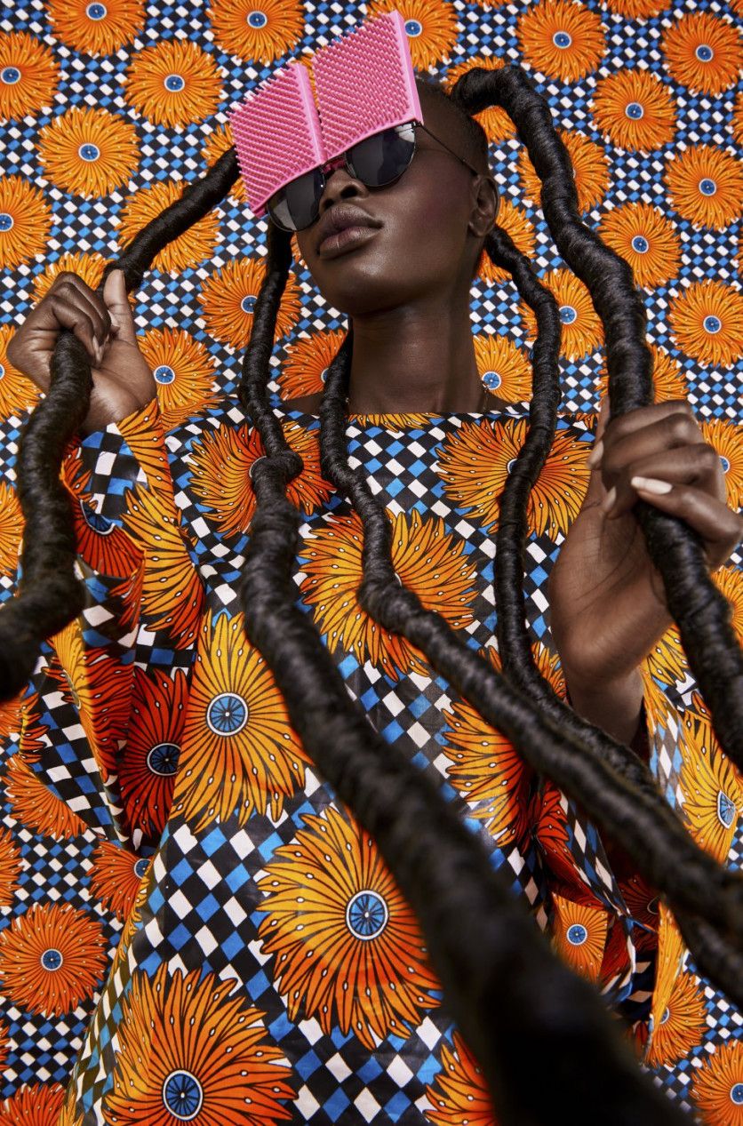 La fotógrafa keniana Thandiwe Muriu usa un proceso meticuloso para construir sus imágenes. Todo comienza con la elección de la tela africana adecuada. Después, crea los peinados y los accesorios. La intención de su serie Camo, de camuflaje, es crear un juego óptico en el que las modelos casi desaparecen.