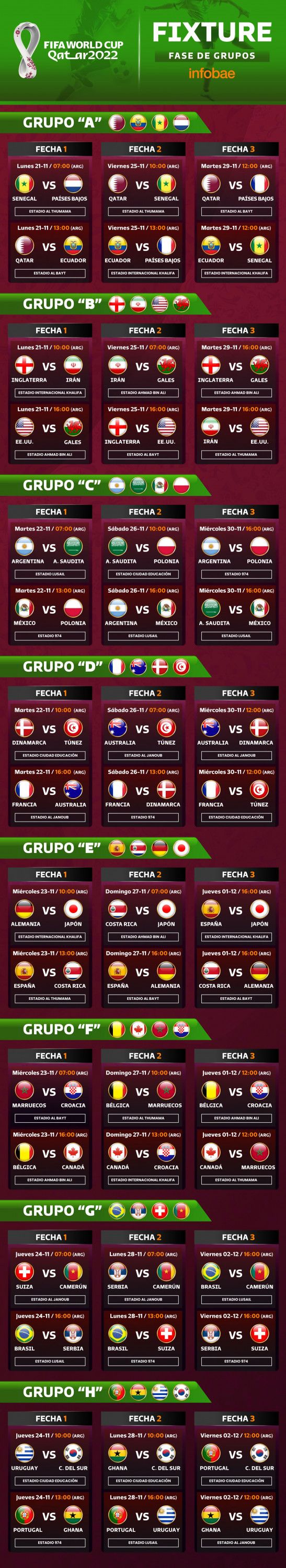 El cronograma completo de los 64 encuentros que se desarrollarán entre el 21 de noviembre y el 18 de diciembre en Qatar.