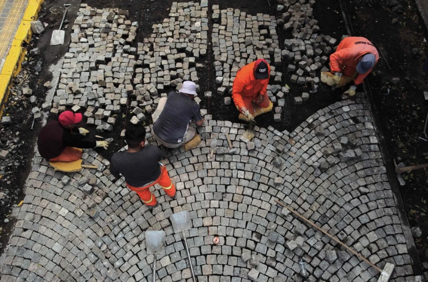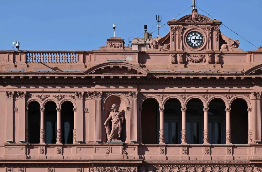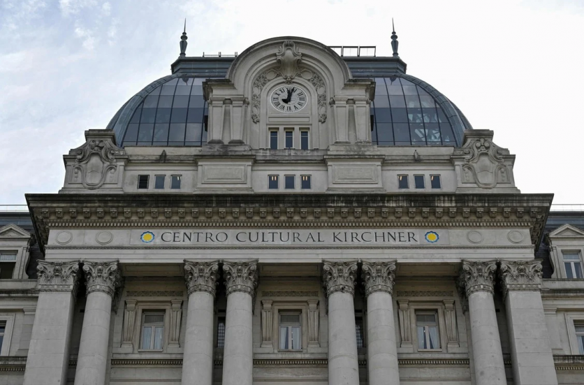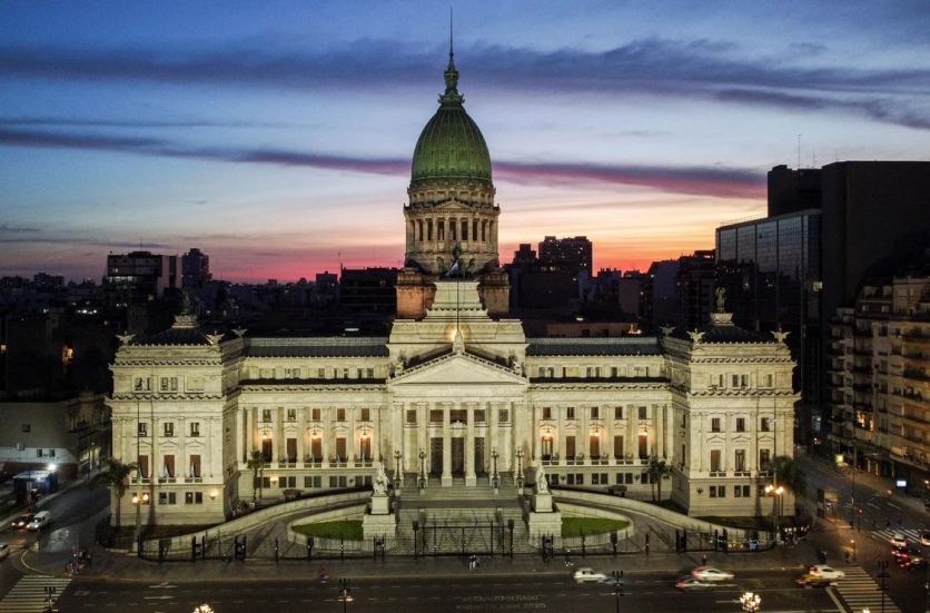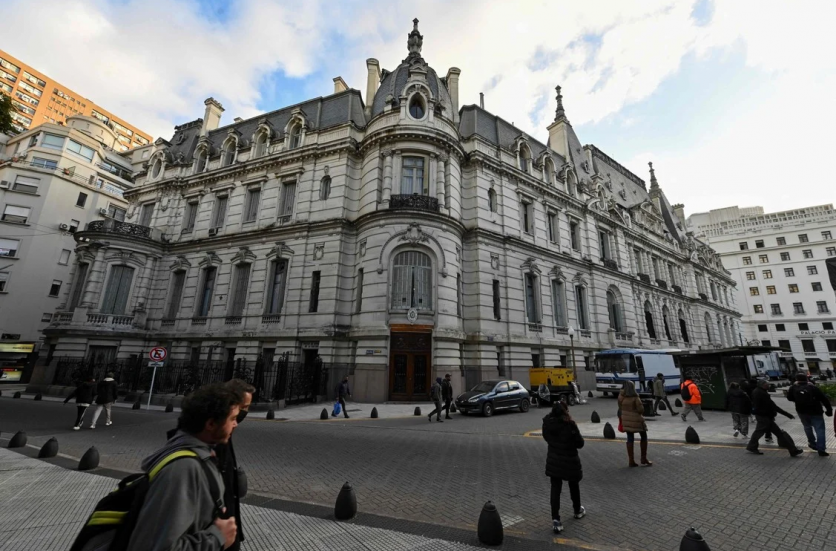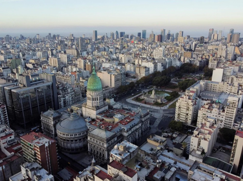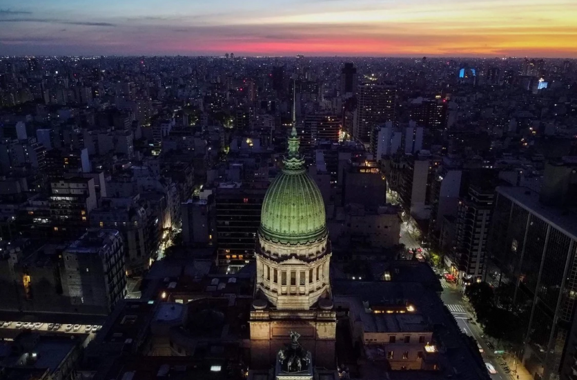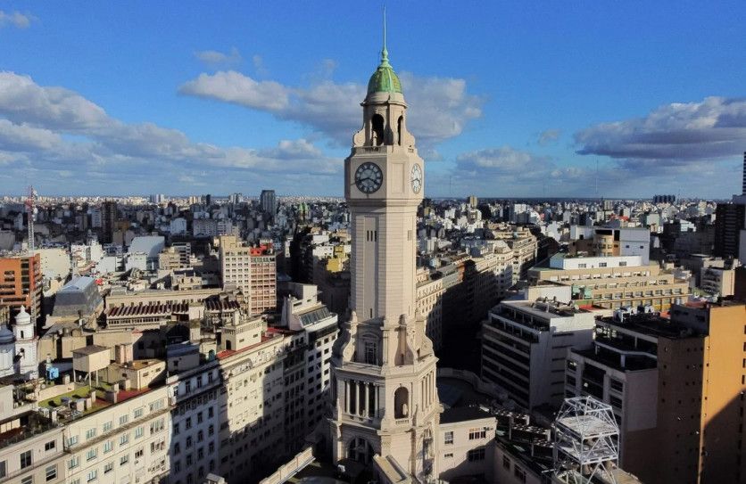 Vista aérea de la torre del Palacio de la Legislatura en Buenos Aires. Los arquitectos, Eduard Le Monnier y Héctor Ayerza, se inspiraron para el diseño en el neoclacisismo francés del siglo XVIII. La torre, de 97 metros de altura, alberga un reloj Westminster con cuatro esferas de 4,5 metros de diámetro. (Foto de Luis ROBAYO / AFP)