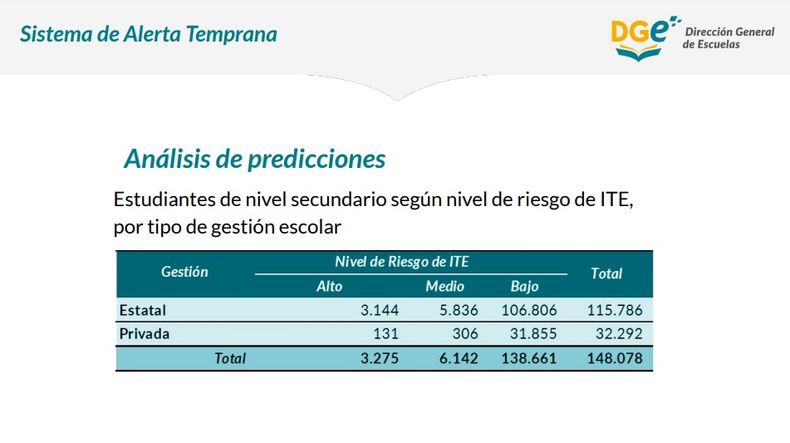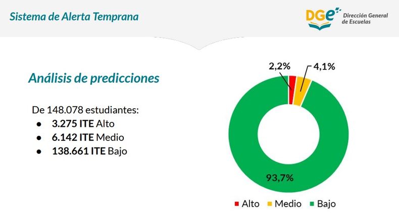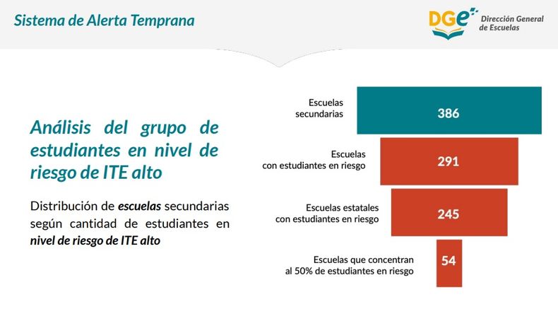 El relevamiento tiene el corte en noviembre del 2022 e indica que, del total de estudiantes de secundarias (148.978) tanto de gestión pública como privada, son 3.275 tienen un nivel alto de riesgo de Interrupción de Trayectoria Escolar (ITE) lo que equivale a un 2,2% del alumnado.