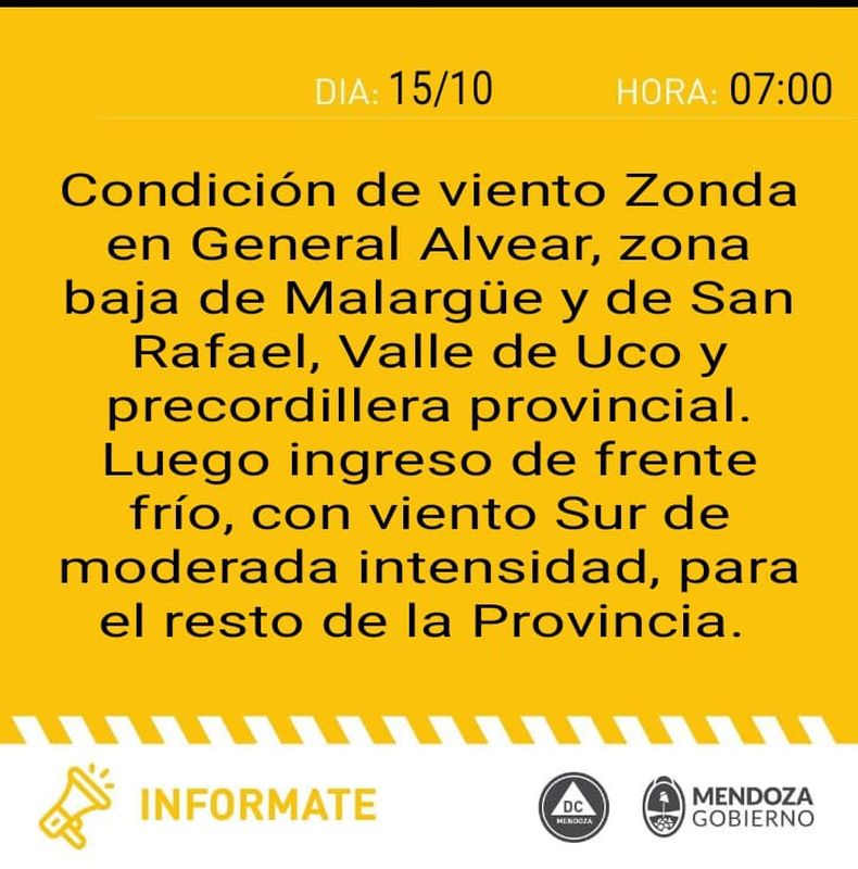 El pronóstico del tiempo de la Dirección de Contingencias Climáticas de la provincia de Mendoza indica que para este miércoles 15 de octubre, habrá viento Zonda en precordillera y sectores del llano. El cielo estará algo nublado con poco cambio de la temperatura. Habrá ingreso de viento sur desde las 20 en zona Sur y desde las 22 en zona Noreste, con velocidades de 55-60 km/h.