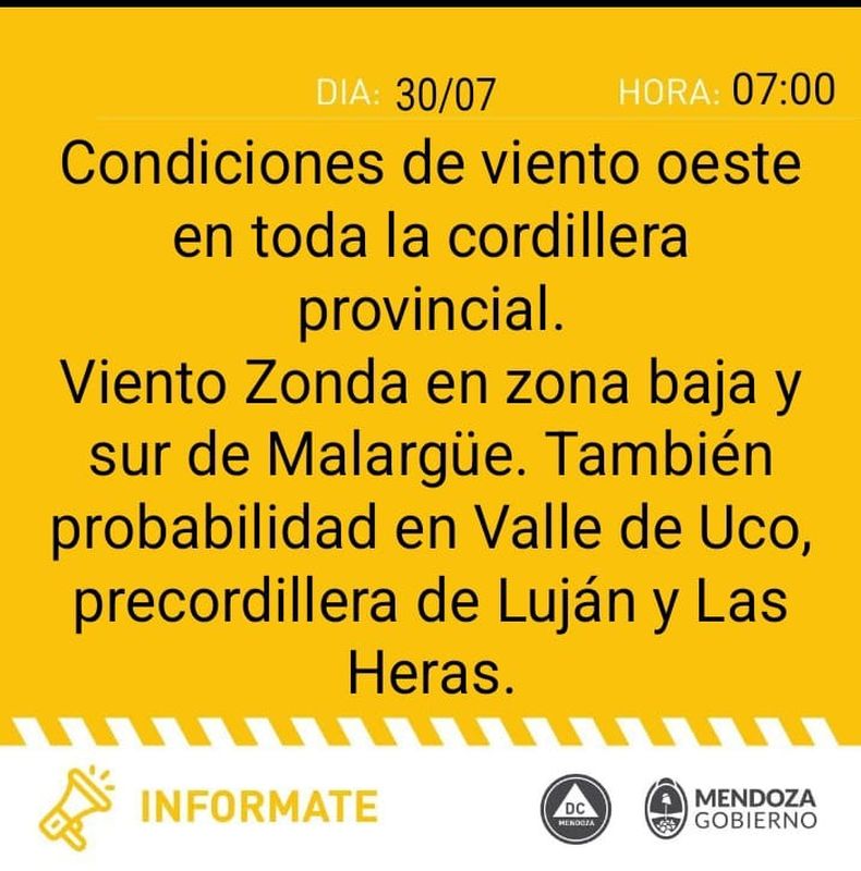 Según el pronóstico del tiempo elaborado por la Dirección de Contingencias Climáticas, se estima para la provincia de Mendoza en la jornada de este miércoles 30 de julio, una jornada parcialmente nublada con poco cambio de la temperatura. Habrá viento Zonda en precordillera y Malargüe.