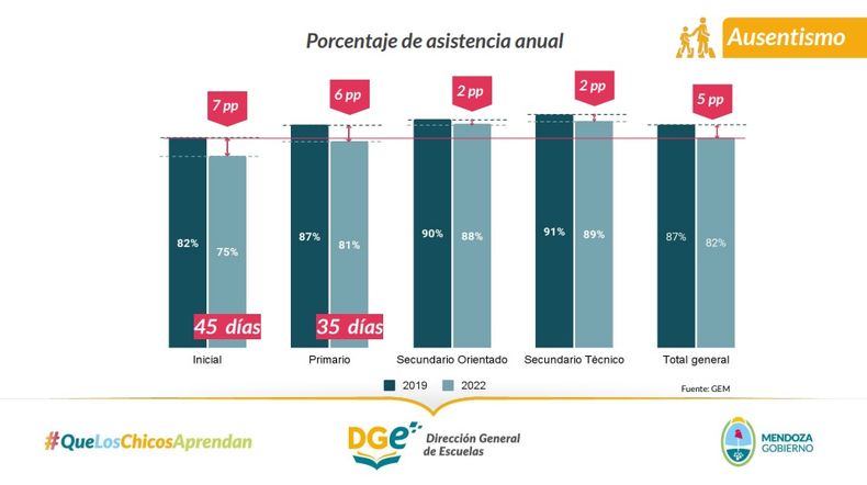 A través de los datos recolectados por el sistema de Gestión Educativa Mendoza (GEM), la DGE detectó que el índice de ausentismo en el nivel inicial y en el primario ha aumentado en el 2022 con respecto al año 2019, previo a la pandemia.