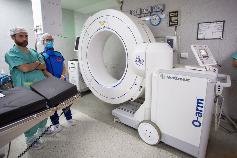 “Es operar con la ayuda de la dirección satelital. Puntualmente, en la cirugía por escoliosis se colocan barras de titanio que están sujetas a las vértebras a través de tornillos, y esos tornillos son los que se colocan en forma asistida, a través de un navegador satelital. Entonces, con esta tecnología la precisión es altísima. Antes, uno solamente contaba con el expertise del cirujano. Ahora, el profesional cuenta con estas herramientas, porque también se ha incorporado un equipo que se llama OArm: un tomógrafo que te permite saber cuál es la dirección en la cual va cada tornillo, la perforación, datos muy precisos. La verdad es que es tecnología de altísima calidad y seguridad. Más adelante vendrá la asistencia robótica, en segundo plano y con eso, vamos a estar en el primer nivel mundial”, detalló Pérez.