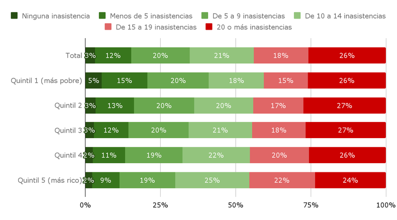 En rigor, los autores ordenaron las respuestas del cuestionario Aprender de menor a mayor según el índice de nivel socioeconómico y conformaron cinco categorías (quintiles). En el Quintil 1, denominado el “más pobre”, se registró un 26% de estudiantes con 20 o más asistencias, mientras que en el Quintil 5, el “más rico”, el resultado es de 24%.