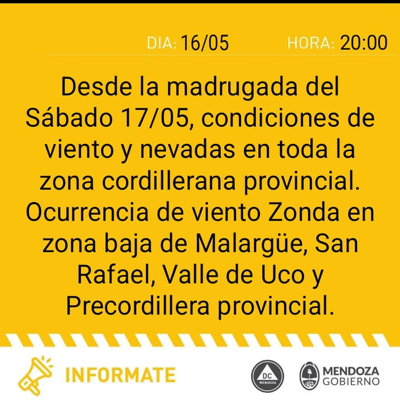 El tiempo en la provincia de Mendoza para este sábado 17 de mayo anticipa una jornada con viento Zonda de intensidad moderada en precordillera y sur provincial. El viento comenzará a bajar desde la madrugada y se extenderá a lo largo del día en diversas zonas del territorio provincial, acompañado por ráfagas intensas, suba de temperatura en el llano y mal tiempo en la cordillera.