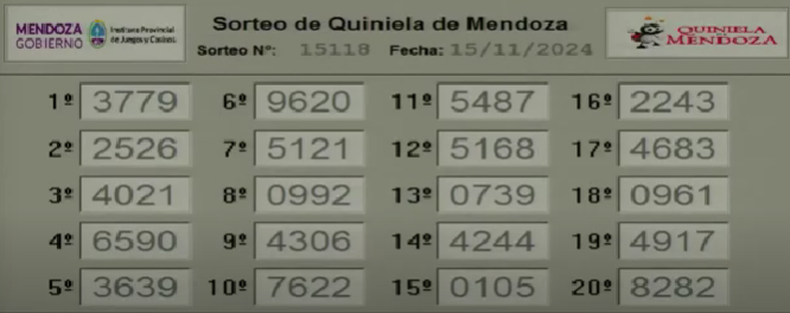 Seguí en vivo los resultados de la Quiniela de Mendoza de este viernes 15 de noviembre. El juego se sortea de lunes a sábados. Conocé los extractos y números a la cabeza de los diferentes sorteos: La Previa, La Primera, La Matutina, La Vespertina y La Nocturna.