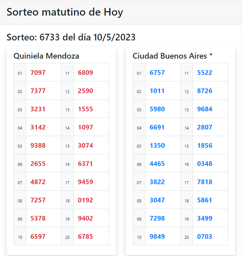 Seguí en vivo los resultados de la Quiniela de Mendoza de hoy, 10 de mayo. El juego se sortea de lunes a sábados. Conocé los números ganadores de hoy. Además, conocé los extractos y números a la cabeza de los diferentes sorteos: La Previa (3696), La Primera (6192), La Matutina (7097), La Vespertina (9279), La Nocturna (1920)