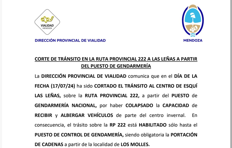 La Dirección Provincial de Vialidad comunicó que está cortado el tránsito al Centro de Esquí Las Leñas, sobre la ruta provincial 222, en el departamento de Malargüe, por el colapso de la capacidad de recibir y albergar vehículos de parte del centro invernal. La concurrencia de turistas al Centro aumentó considerablemente producto del receso invernal en provincia de Mendoza.